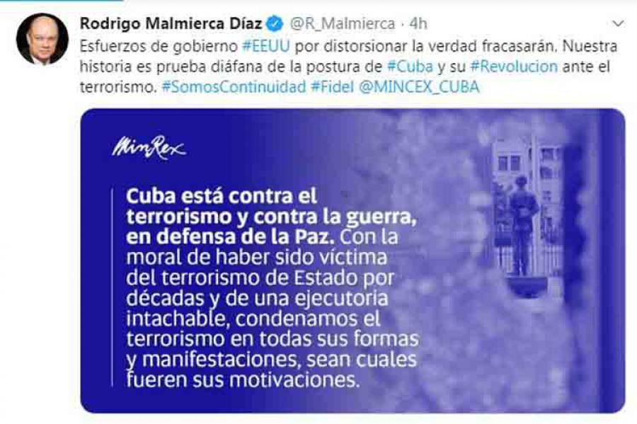 Our history is clear proof of Cuba's position and its Revolution in the face of terrorism, Malmierca wrote on Twitter.