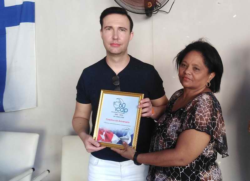 The President of the Las Tunas branch of the Cuban Institute for Friendship with the Peoples, María Romero Rodríguez, delivered the 60th Anniversary Recognition of ICAP to Mr. Tomi Kuhanen as the Brigade for his outstanding career.