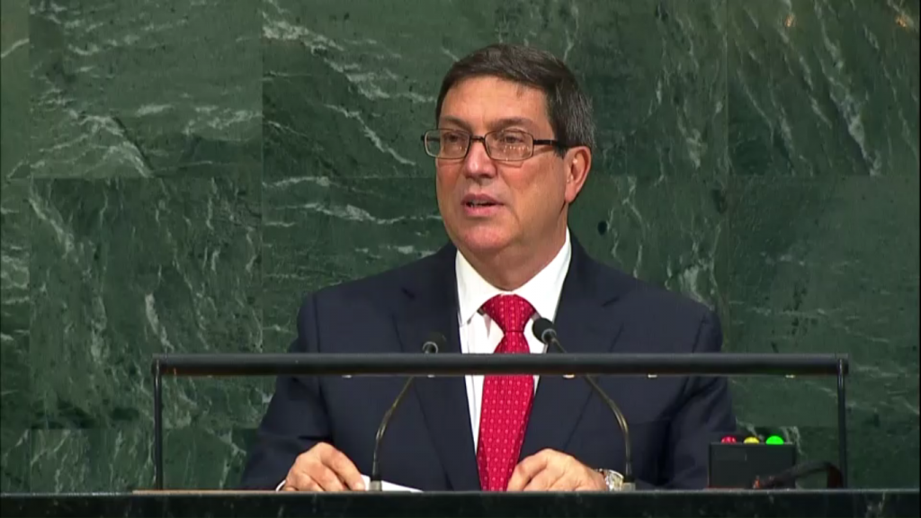 This time we would like to express our strongest condemnation of the disrespectful, offensive and interventionist statement against Cuba and the Cuban government, made three days ago at this rostrum by President Donald Trump. We remind him that the United States, where flagrant human rights violations are committed, which raise deep concern among the international community, has no moral authority to judge my country. We reaffirm that Cuba will never accept any preconditions or impositions, nor will it ever renounce any of its principles.