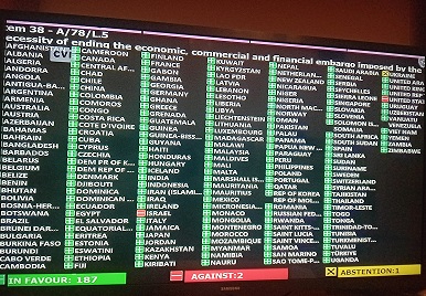 187 países rechazaron una vez más el cruel bloqueo que por más de 60 años mantiene el gobierno norteamericano contra Cuba.
