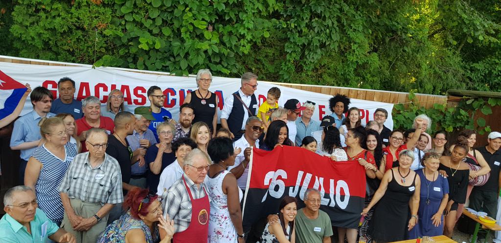 Berna 21 de julio de 2019.- En la tarde ayer, amigas y amigas de Cuba en Suiza conmemoraron el 66 aniversario de los asaltos a los a los Cuarteles Moncada y Carlos Manuel de Céspedes y el 93 aniversario del natalicio líder histórico de la Revolución Cubana, Fidel Castro Ruz, con una actividad organizada por la Embajada de Cuba en Suiza y la Asociación Suiza-Cuba.