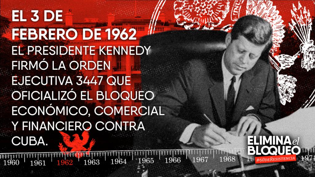 John F. Kennedy, igual que su predecesor, Ike Eisenhower, siguió tratando de aniquilar a nuestra joven Revolución. Pocas semanas antes de la agresión directa por Playa Girón, anunció que estaba considerando la aplicación de la Ley de comercio con el enemigo en el caso de Cuba. El 3 de febrero de 1962 emitió la Proclama 3447, que decretó un “embargo” total del comercio con nuestro país. Se le confirió de esa forma carácter oficial a las acciones económicas agresivas y unilaterales que se venían aplicando contra Cuba desde el triunfo revolucionario.