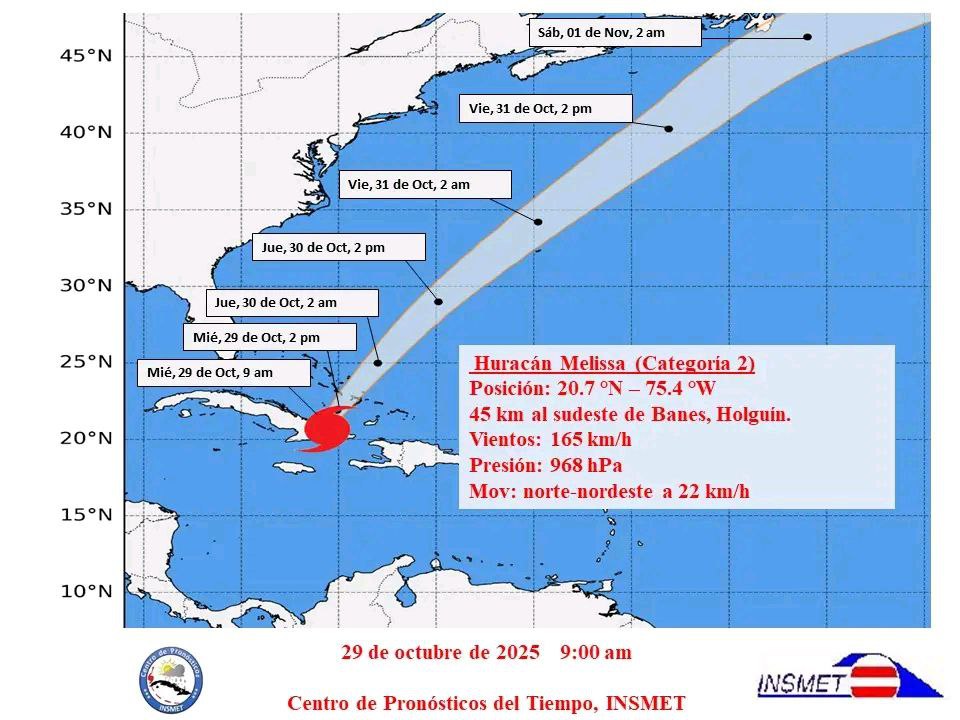 A las nueve de la mañana, la región central del huracán Melissa se localizó por los radares cubanos en los 20.7 grados de latitud Norte y los 75.4 grados de longitud Oeste, posición que lo sitúa a 45 kilómetros al sudeste de Banes perteneciente a la provincia de Holguín. Melissa continúa moviéndose al norte – nordeste, con una velocidad de traslación de 22 kilómetros por hora.