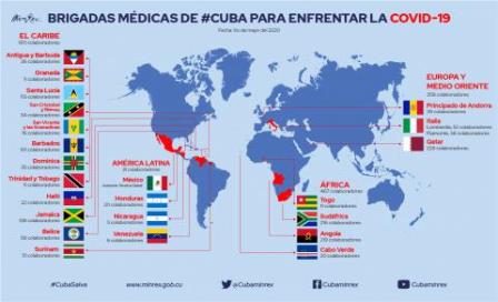 Cubaminrex, 1 de Mayo 2020. Mil 466 profesionales de la salud cubanos, integrados en 23 brigadas médicas "Henry Reeve", se han ido a 22 naciones de Europa, América Latina y el Caribe, África y Medio Oriente, en medio de la pandemia de Covid-19, para ayudar a contener en esos territorios afectados, la propagación de un virus, que ya sabemos, se ganará solo con cooperación y solidaridad.