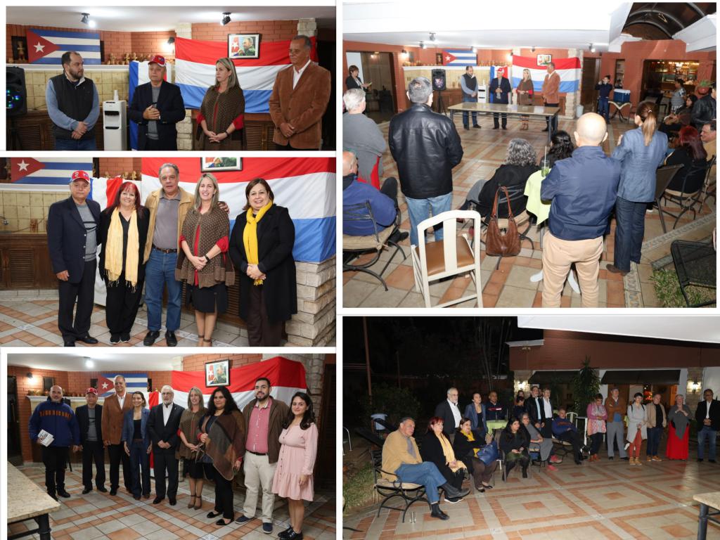 Asunción. 13 de agosto de 2023. La delegación oficial de Cuba que asiste al traspaso de mando presidencial el Paraguay fue bienvenida en acto convocado por la Coordinadora de Solidaridad Paraguay-Cuba el 13 de agosto, ocasión que fue propicia para celebrar también el 97 aniversario del natalicio del líder histórico de las Revolución Cubana. La ministra de Educación, Dra. Naima Trujillo Barreto, acompañada por el embajador Carlos de Céspedes, director de América del Sur de la cancillería cubana, fueron recibidos por líderes políticos, intelectuales, académicos, representantes de organizaciones sociales, gremiales, juveniles y estudiantiles, quienes compartieron ideas e iniciativas sobre la realidad cubana y los retos de ambos países en el actual escenario político regional.