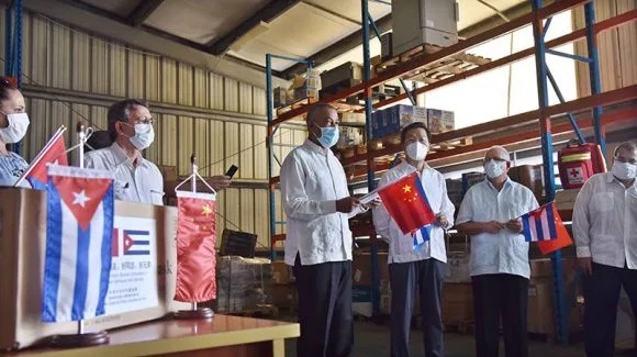 He observado con satisfacción de que el primer lote del donativo del Gobierno chino y de empresas chinas ya han sido distribuido a las distintas instituciones sanitarias del país, hoy hacemos la entrega oficial del donativo ofrecido por el Departamento Internacional del CC del PCCh al Departamento de Relaciones Internacionales del CC del PCC, gesto de amistad y solidaridad del Partido Comunista de China hacia el Partido Comunista de Cuba, y quisiera anticiparles que está previsto la llegada a la Habana del segundo lote del donativo del Gobierno chino mañana, y unos días despúes, el tercer lote. Esperamos de que estas modestas ayudas puedan contribuir a la lucha del pueblo cubano contra la pandemia.