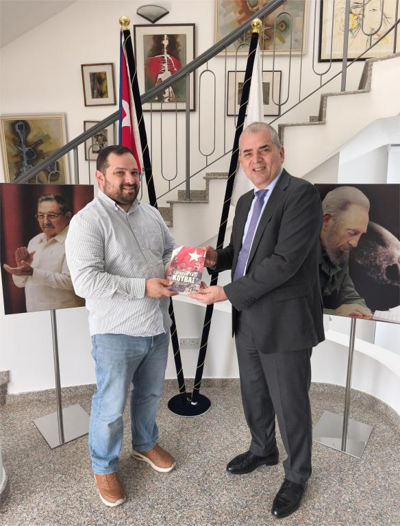 Nicosia, Chipre, 18 de marzo. El embajador cubano en Chipre, Rubén Pino Martínez, recibió este miércoles 18 al amigo Marios Georgiou, jefe y diseñador de la casa editorial chipriota “Almyra”, quien hizo una nueva donación de ejemplares del volumen "Historia de Cuba: El yugo y la estrella", de José Cantón Navarro, cuya primera edición al griego ha logrado insertarse en el mercado chipriota y amplificar el conocimiento de la historia patria de la mayor de las Antillas en la isla del Mediterráneo.