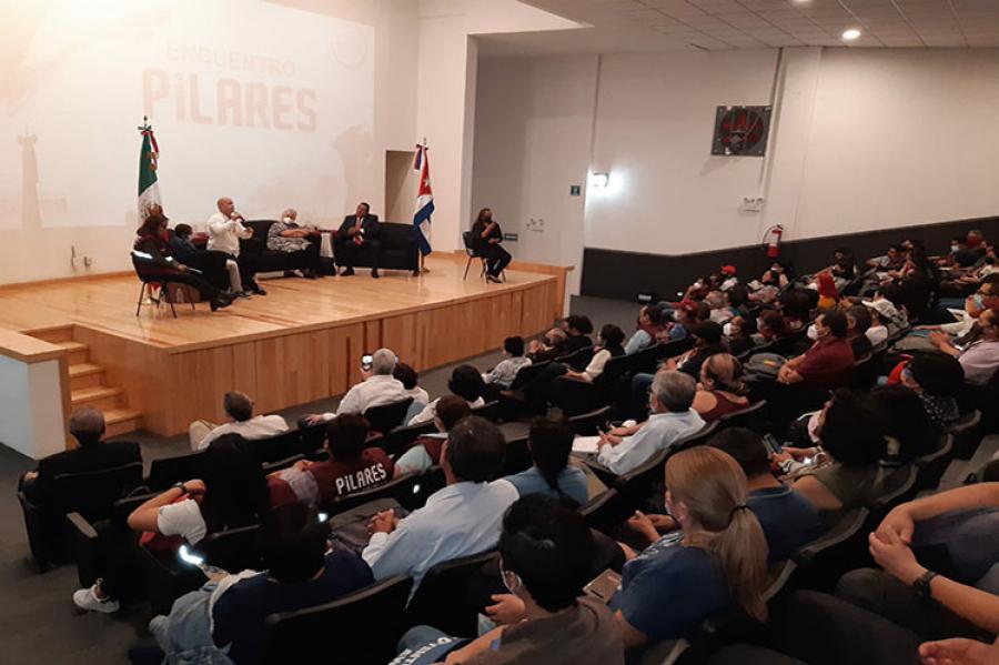 En una conferencia magistral en el auditorio Justo Sierra, en el casco histórico de Ciudad de México, el héroe cubano y la hija del revolucionario argentino cubano conversaron animadamente con decenas de mexicanos que se dieron cita en ese centro como parte del XXVI Encuentro Nacional del Movimiento Mexicano de Solidaridad con Cuba en Xalapa, Veracruz.