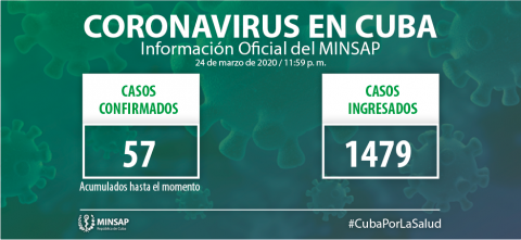 En Cuba se encuentran ingresados para vigilancia clínico- epidemiológica, en los centros de aislamiento y atención creados con este fin, mil 479 pacientes; de ellos 116 extranjeros y mil 363 cubanos. Otras 36 mil 526 personas se vigilan en sus hogares, desde la Atención Primaria de Salud. Hasta el momento se han realizado 738 muestras para detectar la COVID-19, de las cuales han resultado positivas los 57 casos acumulados hasta el momento.