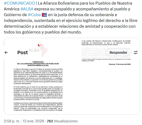 La Habana, 14 de enero de 2026. La Alianza Bolivariana para los Pueblos de Nuestra América, ALBA expresa su respaldo y acompañamiento al pueblo y Gobierno de Cuba en la justa defensa de su soberanía e independencia, sustentada en el ejercicio legítimo del derecho a la libre determinación y a establecer relaciones de amistad y cooperación con todos los gobiernos y pueblos del mundo.