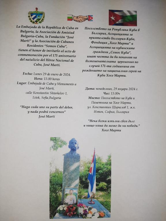El monumento al Héroe Nacional José Martí, erigido en la ciudad de Sofía, en al parque aledaño a la Embajada de Cuba en Bulgaria, será sede del acto conmemorativo por el 171 aniversario de su natalicio, convocado por la Embajada de Cuba, la Asociación de Amistad Bulgaria-Cuba, la Fundación "José Martí" y la Asociación de Cubanos Residentes "Somos Cuba".