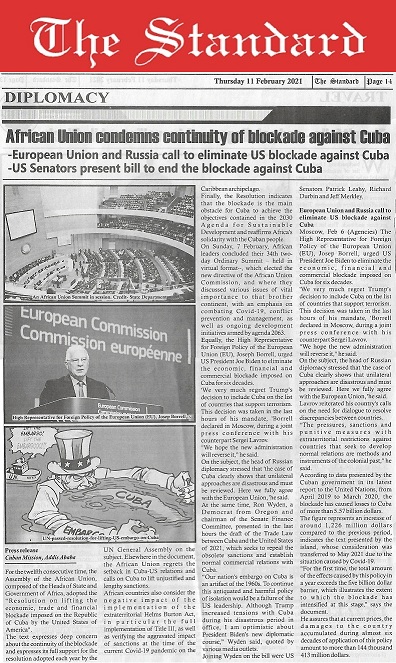 Banjul, 11 feb.- Una nueva Resolución adoptada por la Unión Africana (UA) de rechazo al bloqueo impuesto por EE.UU. a Cuba desde hace casi seis décadas es ampliamente difundida hoy por la prensa gambiana.