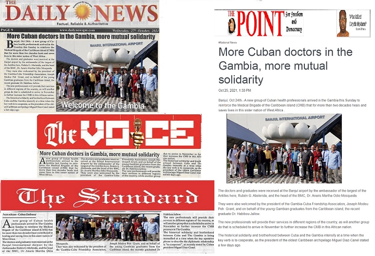 Bajo el titulo Más Médicos cubanos en Gambia, más solidaridad mutua, los cuatro principales cotidianos del país destacaron que los nuevos trabajadores de la salud del decano archipiélago caribeño prestarán sus servicios en diferentes regiones, como lo hará otro grupo que está previsto llegue en noviembre venidero para incrementar aún más la BMC.