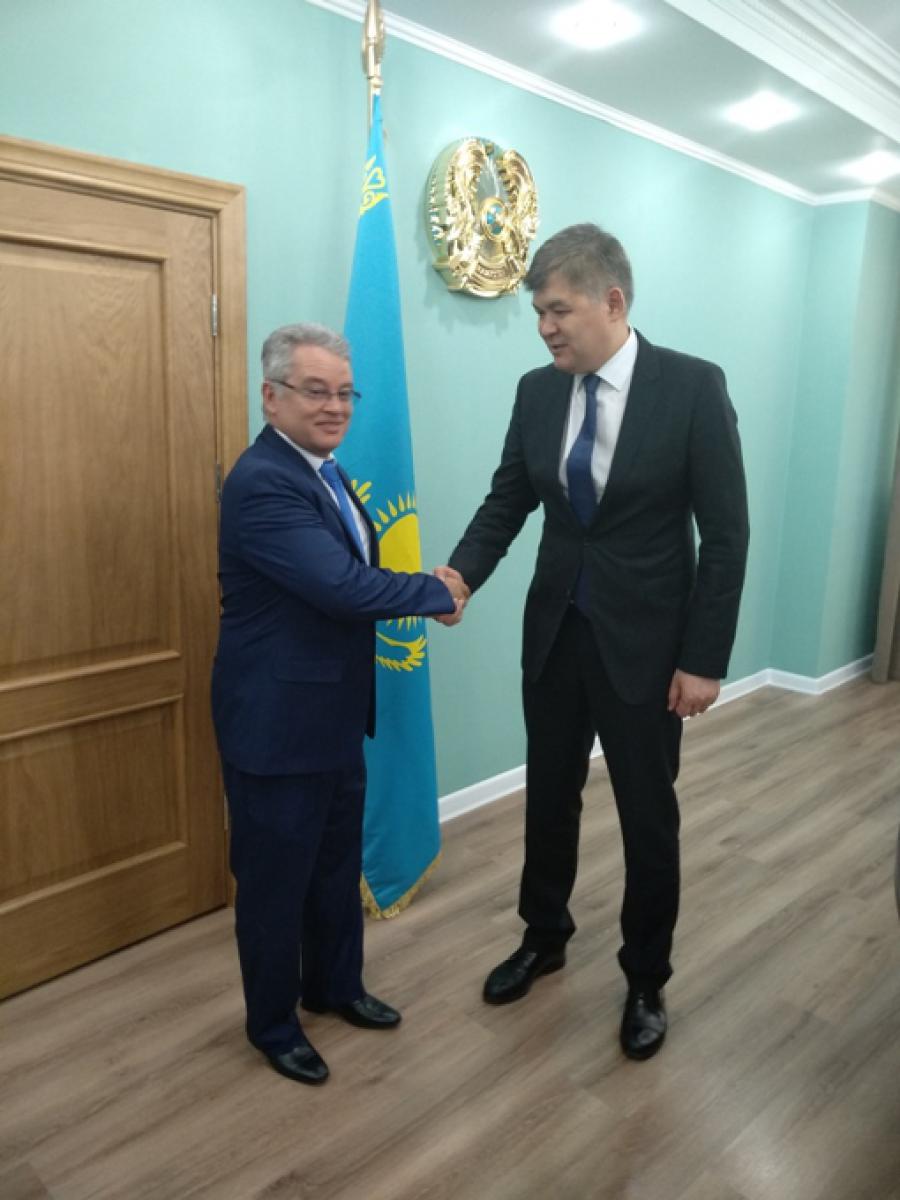 Astaná, 26 de junio de 2018. El Ministro de Salud Pública de Kazajstán, Elzhan Amantaiuly Bistanov, recibió en la sede de ese Ministerio al embajador de Cuba en el país euroasiático, Emilio Pevida Pupo, con quien analizó las perspectivas de la cooperación médica entre ambos países.