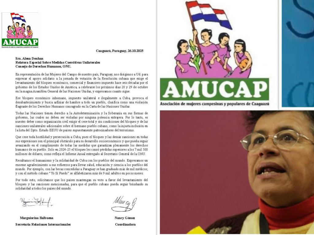 Asunción, Paraguay. En vísperas de efectuarse la visita oficial a Cuba de la Sra. Alena Douhan, Relatora Especial del Consejo de Derechos Humanos (CDH) de la Organización de las Naciones Unidas (ONU), con el mandato para evaluar las consecuencias negativas de la impelementación de medidas coercitivas unilaterales, la directiva de la Asociación de Mujeres del Campo de Paraguay (AMUCAP) le dirigió una carta solidaria con la Isla desde Caaguazú a su oficina en Ginebra, Suiza. En la misiva firmada por la Coordinadora Nancy Gómez y la Secretaria de Relaciones Internacionales, Marguiorina Balbuena, se brindan argumentos que muestran cómo el injusto bloqueo económico, comercial y financiero impuesto por el gobierno de los EEUU viola los derechos humanos del pueblo cubano. Acceda al texto íntegro de la carta: