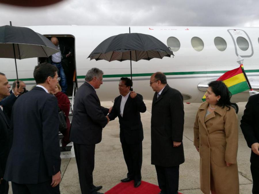 A su llegada al Aeropuerto Internacional El Alto, Díaz-Canel fue recibido por los ministros bolivianos René Martínez, de la Presidencia y Reymi Ferreira, de Defensa; la vicecanciller Guadalupe Palomeque; y el embajador designado para Cuba, Juan Ramón Quintana. Por la parte cubana, se encontraban presentes el embajador en Bolivia, Benigno Pérez Fernández, y otros representantes de la misión diplomática de la Isla.