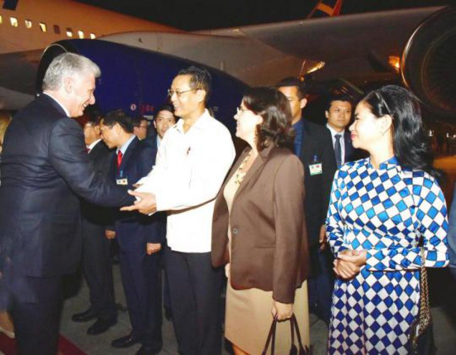 Al aeropuerto internacional de Noi Bai acudieron a darle la bienvenida la vicepresidenta de Vietnam Dang Thi Ngoc Thinh, y la embajadora cubana, Lianys Torres, quien se incorporará a su delegación. También integran la comitiva el vicepresidente del Consejo de Ministros, Ricardo Cabrisas; el Ministro de Relaciones Exteriores, Bruno Rodríguez, el titular de  Comunicaciones, Jorge Luis Perdomo, así como el Ministro de  Energía y Minas, Raúl García.