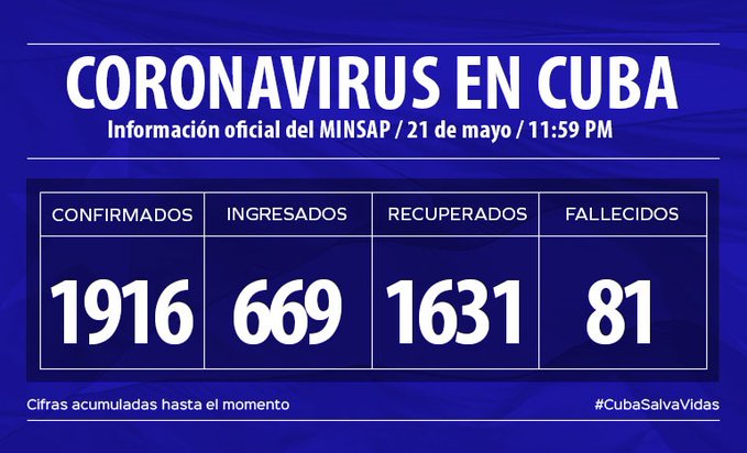 Al cierre del día de ayer, 21 de mayo, se encuentran ingresados en hospitales para vigilancia clínica epidemiológica 669 pacientes. Otras 1 mil 790 personas se vigilan en sus hogares, desde la Atención Primaria de Salud.