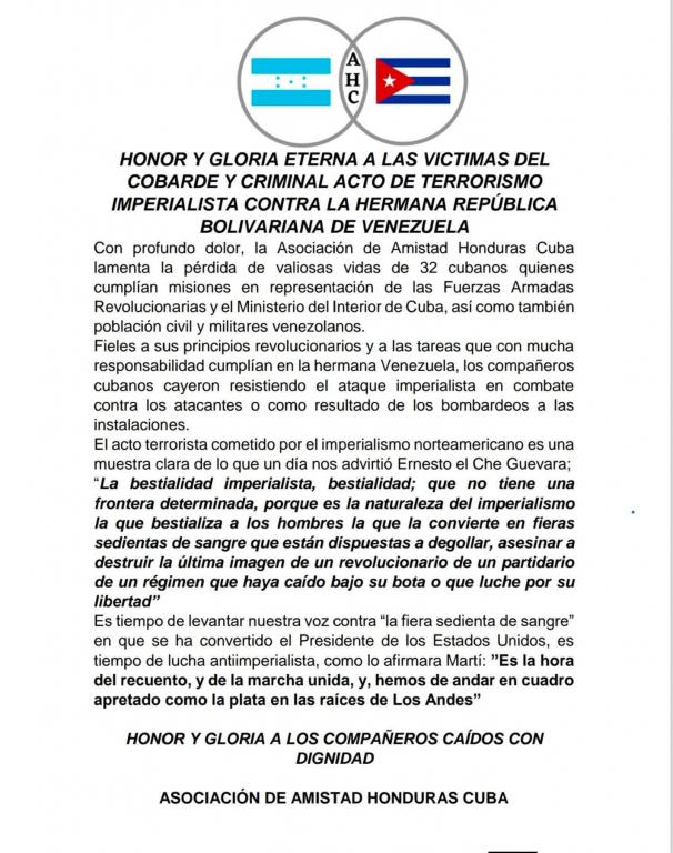 Tegucigalpa, 7 de enero de 2026.- La Asociación de Amistad Honduras Cuba emitió un sentido mensaje de condolencias para honrar la memoria de los 32 ciudadanos cubanos que perdieron la vida en el cobarde y criminal acto de terrorismo de Estado imperialista contra la hermana República Bolivariana de Venezuela.