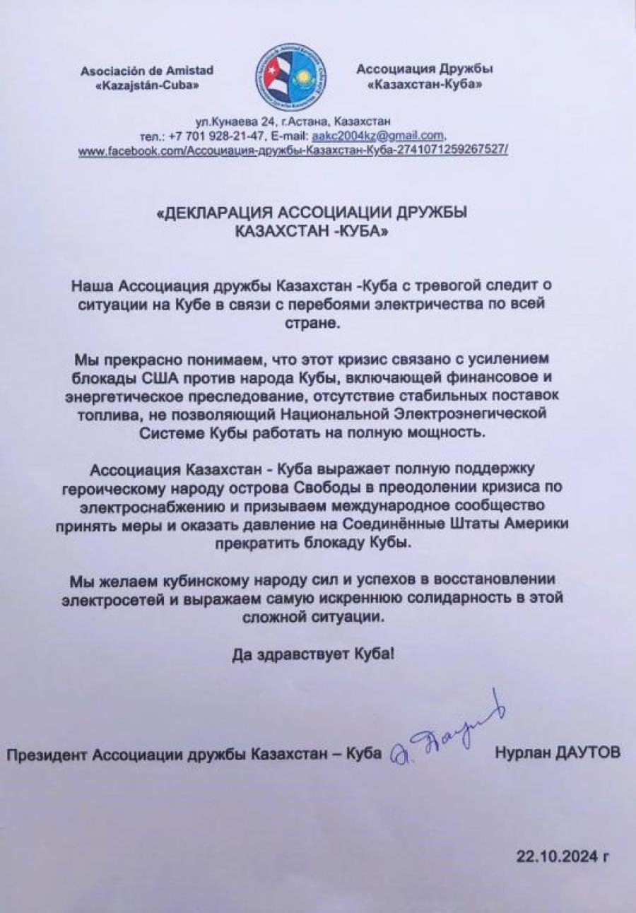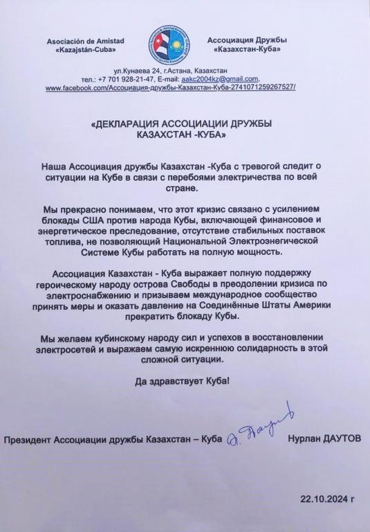 La Asociación Kazajstán-Cuba expresa pleno apoyo al heroico pueblo de la Isla de la Libertad para superar la crisis de suministro eléctrico y llama a la comunidad internacional a tomar medidas y presionar a los Estados Unidos de América para que pongan fin al bloqueo a Cuba.