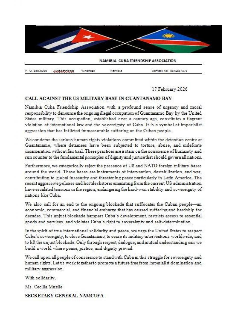La Sra. Cecilia Muzile, Secretaria General de la Asociación de Amistad Namibia-Cuba, publicó un comunicado sumándose a los días mundiales de acción contra la presencia militar estadounidense en Guantánamo y en rechazo a la intervención extranjera de Estados Unidos y la OTAN.