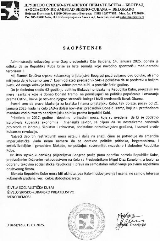 Nosotros, miembros de la Asociación de Amistad Serbio-Cubana de Belgrado, saludamos esta decisión, pero creemos que es sólo un "gesto" con el que el presidente saliente de los Estados Unidos está tratando de presentarse de una manera mejor en su relación con Cuba durante los últimos cuatro años.