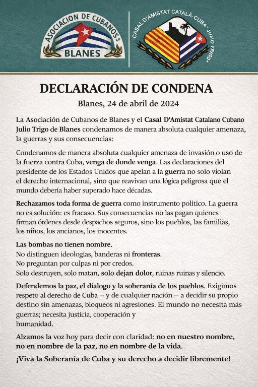 Blanes, Gerona, Cataluña. 3 de febrero de 2026: La Asociación de Cubanos Residentes en Blanes, municipio de la provincia catalana de Gerona, junto con la Agrupación de Amistad Catalá – Cuba “Julio Trigo”, mediante Declaración Conjunta, rechazaron de manera absoluta cualquier amenaza de invasión, uso de la fuerza o retórica belicista contra Cuba, en abierta violación del Derecho Internacional y de los principios de convivencia pacífica entre las naciones.