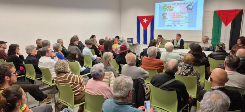 Barcelona, Cataluña. 9 de febrero de 2026. Cubanos integrantes de la Asociación de Cubanos Residentes en Cataluña “José Martí”, junto a miembros del Movimiento de Solidaridad con Cuba en Cataluña DEFENSEM Cuba, inauguraron la campaña “100 años con Fidel. La cita, efectuada en el Centro Cultural barcelonés, Ateneu l’Harmonia de Sant Andreu, contó con la presencia amigos del Partido Comunista, miembros de agrupaciones solidarias con Cuba y personal del Consulado General. Además, la Mesa contó con la presencia del amigo de Cuba y profesor Felipe Aranguren, Claudia González, Miembro de la Directiva de la ACRC “José Martí” y el Cónsul General de Cuba en Barcelona, Alejandro Castro Medina.