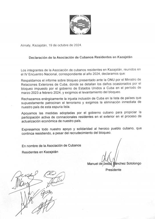 Los integrantes de la Asociación de Cubanos Residentes en Kazajstán, reunidos en el IV Encuentro Nacional, correspondiente al año 2024, declaramos que:
