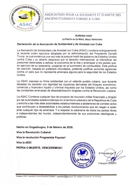 La Embajada de la República de Cuba en Burkina Faso agradece y destaca la firme declaración de la Asociación de Solidaridad y de Amistad con Cuba (ASAC), que condena la reciente orden ejecutiva de Estados Unidos y el recrudecimiento de las presiones económicas contra nuestro país.