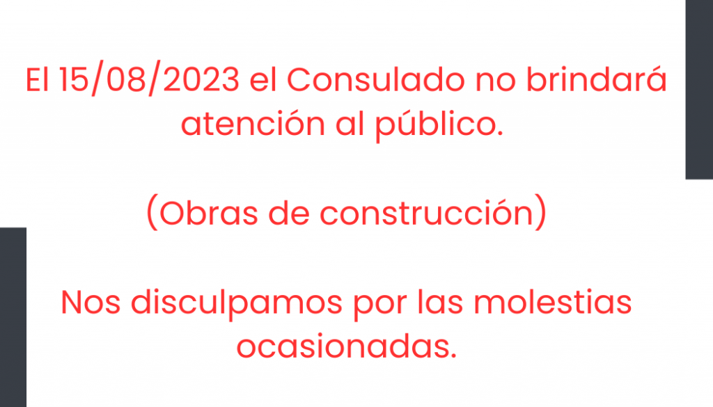 Ago112023 El Consulado no brindará atención al público el martes 15 de agosto.Disculpen las molestias ocasionadas. Categoría: EventosRSS Minrex: