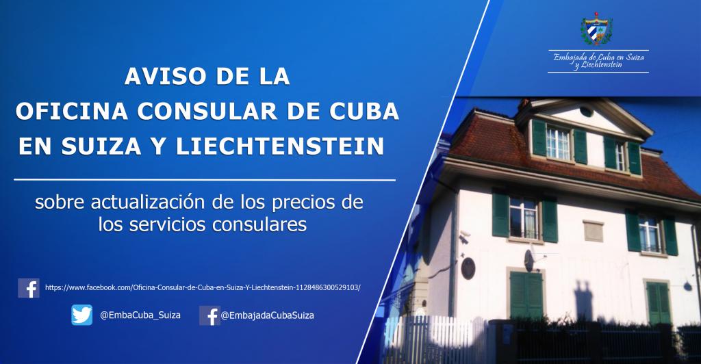 Berna, 31 de enero de 2019.- A partir del 1ro. de febrero de 2019, se actualizarán los precios de los servicios consulares que presta la Oficina Consular de la Embajada de Cuba en Suiza y Liechtenstein a ciudadanos cubanos y de otras nacionalidades residentes en estos 2 países.