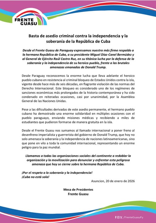 Desde Paraguay, la mesa de presidentes del Frente Guasú ha enviado un enérgico mensaje de solidaridad con el pueblo cubano y la máxima dirección de nuestro país, en especial al general de ejército Raúl Castro. En él llama a cesar el asedio criminal contra Cuba y deja claro que permanecerá en solidaridad junto a la Revolución cubana.