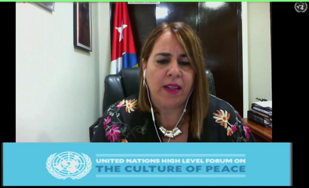 La representante cubana expresó el compromiso de Cuba con la paz, signataria y defensora de la Declaración y Programa sobre una Cultura de Paz, así como la Declaración de América Latina y el Caribe como Zona de Paz, adoptada en 2014 en La Habana, en el marco de la II Cumbre de la CELAC.