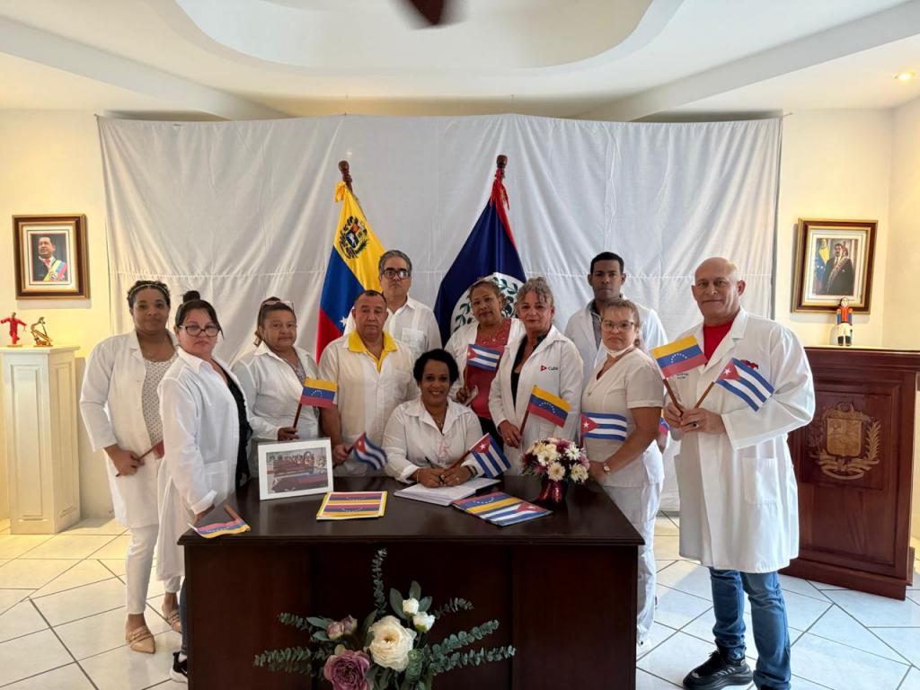 Belmopán, 16 de enero de 2025,- En un emotivo acto de solidaridad y respeto, la Brigada Médica Cubana en Belmopán, Juan Gualberto Gómez, realizó una visita a la Embajada de Venezuela para firmar el libro de condolencias en memoria de los venezolanos caídos en el reciente ataque militar por parte de Estados Unidos. Durante esta ceremonia, también se rindió tributo a los 32 cubanos que perdieron la vida defendiendo la soberanía de la hermana República Bolivariana de Venezuela.