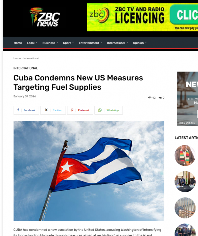 Harare, 31 de enero de 2026 – Cuba condenó la nueva escalada de Estados Unidos y acusó a Washington de intensificar su prolongado bloqueo mediante medidas destinadas a restringir el suministro de combustible a la isla, reflejó hoy la corporación televisiva de Zimbabwe ZBC.