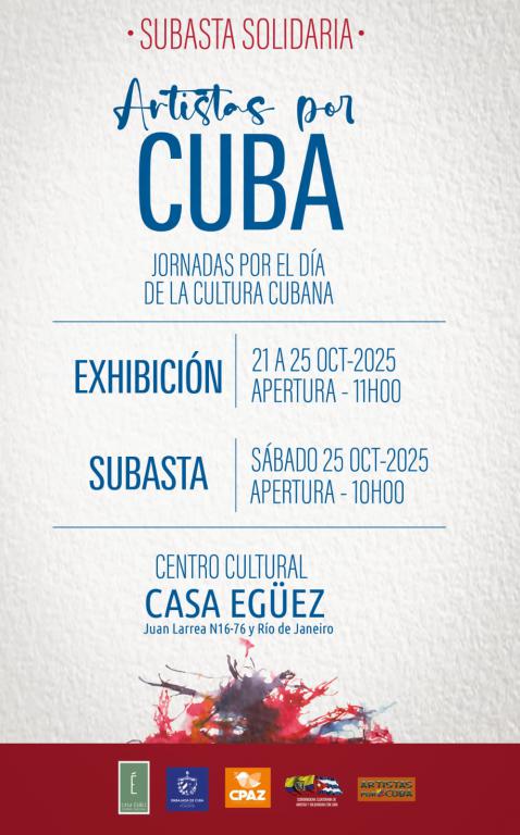 Quito, 6 de octubre de 2025. En el Marco del Dia de la cultura cubana, la Coordinadora por la Paz, la Soberanía, la Integración y la No Injerencia y la Asociación de Cubanos Residentes (ACURE), realizarán la campaña Internacional "Por "Amor a Cuba", espacio que se viene desarrollando durante este año en conjunto con la Embajada de Cuba en Ecuador, con la propuesta de una Subasta Solidaria de Artistas por Cuba, donde más de cuarenta artistas ecuatorianos, cubanos y latinoaméricanos, con más de 62 obras de arte, óleos, serigrafía, lienzografía, grabados, tinta, fotografía, dibujo, expondrán su arte. Los fondos recaudados en la subasta servirán para la compra de Insumos médicos para la isla.