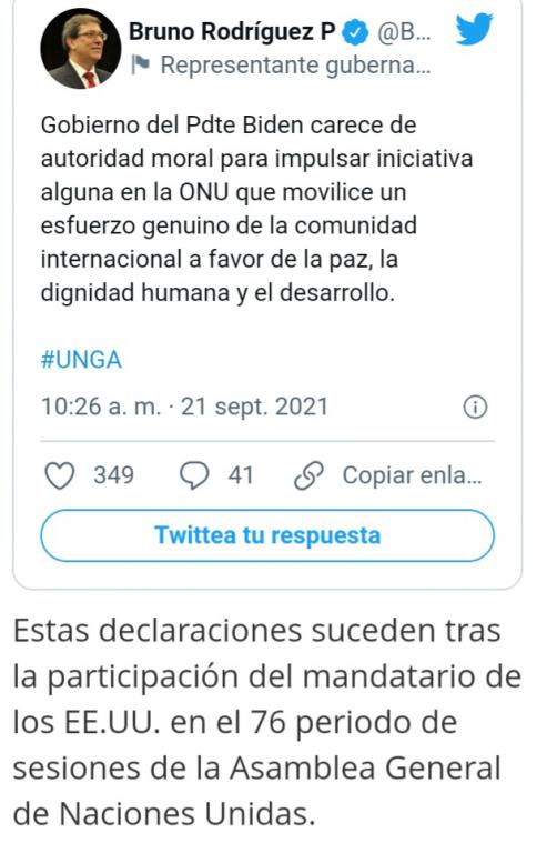 Biden «comete un grave error, con consecuencias para todos, en su empeño por dividir al mundo entre quienes se le someten y quienes defienden con dignidad su derecho soberano a la autodeterminación», señaló Bruno Rodríguez. A través de su perfil en Twitter, el ministro de Relaciones Exteriores de Cuba, Bruno Rodríguez Parrilla señaló que el gobierno del Presidente estadounidense, Joe Biden, carece de autoridad moral para impulsar iniciativas que movilicen un esfuerzo genuino de la comunidad internacional a favor de la paz, la dignidad humana y el desarrollo. Estas declaraciones suceden tras la participación del mandatario de los EE.UU. en el 76 periodo de sesiones de la Asamblea General de Naciones Unidas. Leer más: http://www.granma.cu/mundo/2021-09-21/canciller-cubano-sobre-discurso-de... (Fuente: periódico GRANMA)