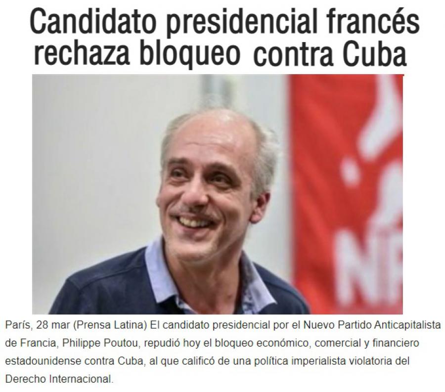 París, 28 mar (Prensa Latina) El candidato presidencial por el Nuevo Partido Anticapitalista de Francia, Philippe Poutou, repudió hoy el bloqueo económico, comercial y financiero estadounidense contra Cuba, al que calificó de una política imperialista violatoria del Derecho Internacional.