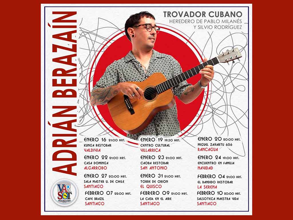 Santiago de Chile, 23 de enero de 2026.- Con letras de alto nivel poético que invitan a la reflexión, el cantautor cubano Adrián Berazaín realiza hoy una serie de presentaciones en Chile, en un recorrido descrito por él mismo como una gira de amor.