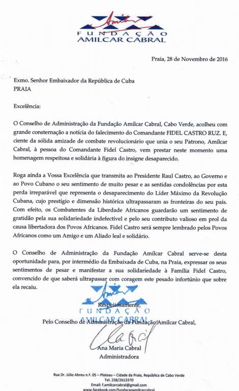 CARTA DE CONDOLENCIAS DE LA FUNDACION ALMICAR CABRAL