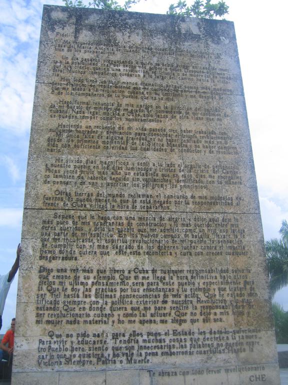 Digo una vez más que libero a Cuba de cualquier responsabilidad, salvo la que emane de su ejemplo. Que si me llega la hora definitiva bajo otros cielos, mi último pensamiento, será para este pueblo y especialmente para ti. Que te doy las gracias por tus enseñanzas y tu ejemplo y que trataré de ser fiel hasta las últimas consecuencias de mis actos. Que he estado identificado siempre con la política exterior de nuestra revolución y lo sigo estando. Que en dondequiera que me pare sentiré la responsabilidad de ser revolucionario cubano y como tal actuaré. Que no dejo a mis hijos y mi mujer nada material y no me apena; me alegro que así sea. Que no pido nada para ellos, pues el Estado les dará lo suficiente para vivir y educarse.