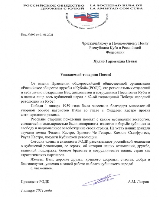 En nombre de la Junta Directiva de la organización pública panrusa " Sociedad de la Amistad Ruso-Cubana" (SARC), de sus oficinas regionales y en el mío propio, le felicito a Usted, a los diplomáticos y trabajadores de la Embajada de Cuba y, por su intermedio, a todo el pueblo cubano con motivo del sexagésimo segundo aniversario de la Victoria de la Revolución Popular en Cuba. La victoria del 1 de enero de 1959 se consiguió gracias a la lucha larga y decidida de los patriotas cubanos liderados por Fidel Castro contra el régimen antipopular. Los rusos de las generaciones mayores recuerdan con qué admiración, simpatía y solidaridad sin precedentes fueron recibidas las noticias sobre la lucha de los cubanos por la libertad y liberación nacional de su país. Los nombres de Fidel Castro, Ernesto Che Guevara, Camilo Cienfuegos, Raúl Castro, las consignas de la revolución cubana sonaban en los labios de nuestros ciudadanos. Hoy, los miembros y activistas de SARC cuentan a los jóvenes rusos sobre la revolución cubana, sus héroes, la historia de nuestras relaciones, la amistad, el apoyo mutuo, la hermandad militar y la colaboración entre nuestros países en su carácter de los socios estratégicos. Les deseamos, estimados amigos, buena salud, felicidad, bienestar y prosperidad, éxitos en su trabajo en beneficio del pueblo cubano!