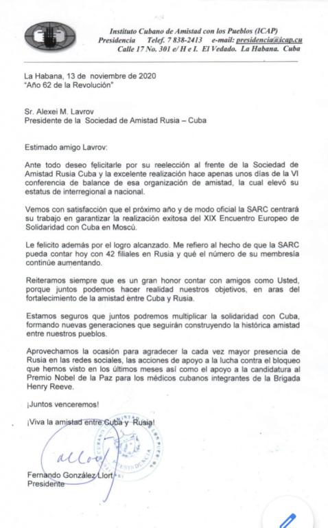 Carta de felicitación del Presidente del Instituto Cubano de Amistad con los Pueblos, Fernando González Llort a Alexei Lavrov, por su reelección como Presidente de la Sociedad de Amistad Rusia - Cuba.