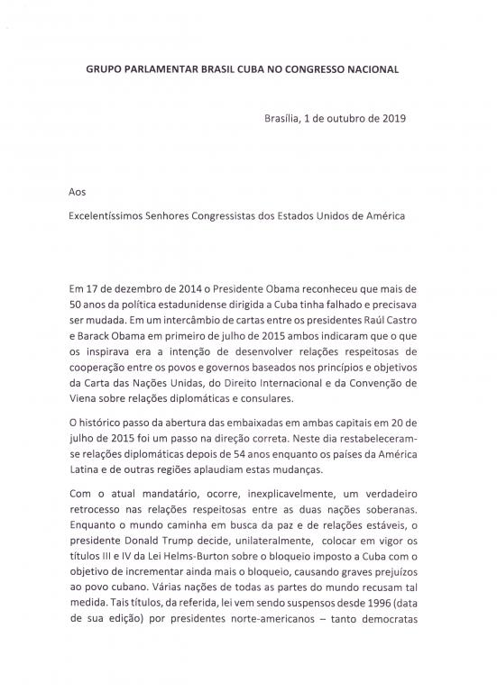 Carta de parlamentarios de Brasil al congreso norteamericano.