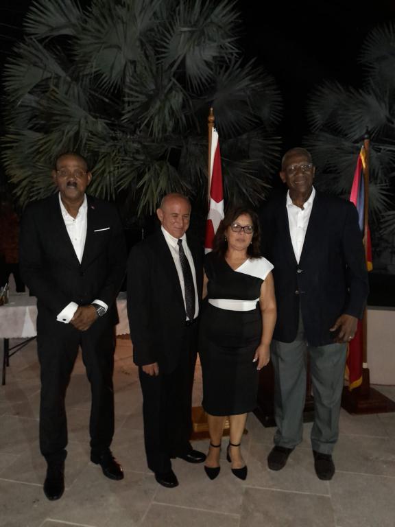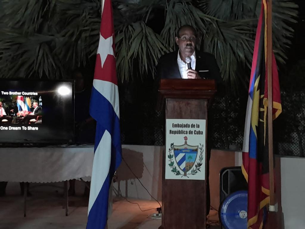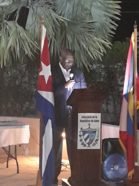 Con comidas y bebidas típicas cubanas se celebró el 30 Aniversario del establecimiento de la relaciones diplomática entre Cuba y Antigua y Barbuda en la embajada cubana en territorio antiguense. En la celebración estuvieron presentes el Gobernador General de Antigua y Barbuda Sir. Rodney Williams, el Primer Ministro Gaston Browne, el Líder de la Oposición Jamal Pringle, la Presidenta del Senado Alincia Williams, Varios miembros del gabinete del gobierno, asi como parlamentarios, representantes del Cuerpo Diplomático y amigos de la solidaridad con Cuba. Al referirse a esta fecha histórica el Gobernador Sir. Rodney Williams manifiesto su agradecimiento en nombre de Antigua y Barbuda por el apoyo y solidaridad mostrada por Cuba durante todos estos años hacia su país, por su parte el Primer Ministro Gaston Browne hizo un breve resumen de estos 30 años de relaciones entre los dos paises calificándolas como un ejemplo de vínculos entre dos pueblos hermanos basados en el respeto mutuo y el reconocimiento a los valores de soberanía e independencia. Ambos calificaron como invaluable el apoyo de Cuba a Antigua y Barbuda en el enfrentamiento a la pandemia de Covit 19 y reiteraron que Antigua y Barbuda estará siempre al lado del pueblo y gobierno cubano en su lucha contra el bloqueo. En la celebración tambien intervino el Embajador Lionel ¨Max´ Hurst quien rememoro el 6 de Abril de 1994 cuando en su calidad de Embajador de Antigua y Barbuda ante las Naciones Unidas tuvo a su cargo la firma oficial del establecimiento de las relaciones diplomáticas entre los dos paises. Por su parte el Embajador Cubano Sergio Martínez Gonzáles al hacer uso de la palabra agradeció la invariable postura de Antigua y Barbuda durante todos estos años en favor de la lucha del pueblo cubano en contra del genocida bloqueo Estadounidense y contra la inclusion de Cuba en la lista de paises patrocinadores del terrorismo, el diplomático cubano refirió que este 30 Aniversario tambien debe constituir momento de reflexión sobre como podemos continuar fortaleciendo nuestros lazos de amistad solidaria, colaboración, integración y los actuales vínculos en el terreno económico comercial, en mutuo beneficio de nuestros dos pueblos. Durante el encuentro fue trasmitido un video con imagenes que recogen un breve resumen de estos 30 años de relaciones diplomáticas.