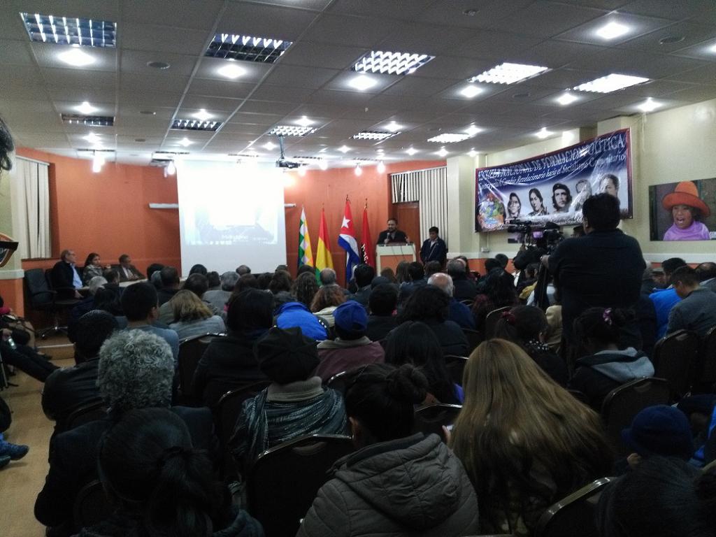 Organizado por el Comité 90 Años de Fidel, la Escuela de Formación Política y la Embajada de Cuba, con el apoyo del MINSA, el acto tuvo como oradores al destacado historiador y profesor Dr. José Roberto Arze; la ministra de Salud, Ariana Campero; y el vicetitular de la Presidencia para la Coordinación con los Movimientos Sociales, Alfredo Rada.