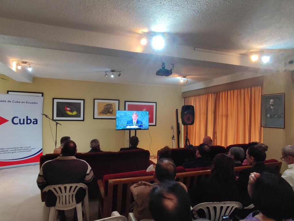 En la sede de la embajada cubana en Quito se siguió el debate del organismo internacional y con aplausos y exclamaciones de «Viva Cuba» y «Abajo el bloqueo» se celebró que por trigésimo primera ocasión la comunidad internacional rechazó la política de cerco económico contra la isla.