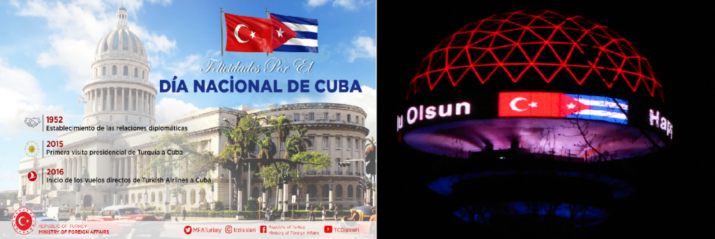 El Ministerio de Relaciones Exteriores turco difundió un cálido mensaje por la ocasión en sus cuentas de Redes Sociales, que rememoró hitos de los vínculos entre los dos países como el establecimiento de las relaciones diplomáticas en 1952, la visita del presidente Recep Tayyip Erdogan a La Habana en el 2015 y el inicio de los vuelos de la aerolínea “Turkish Airlines” a Cuba en el 2016.