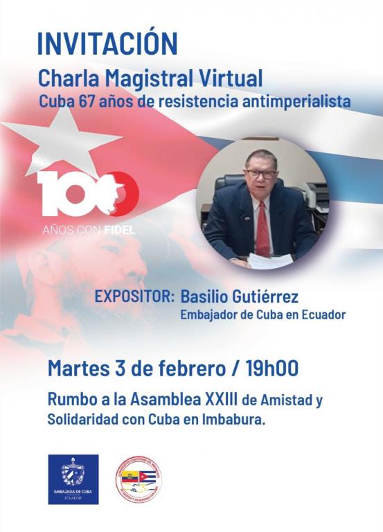 Quito, 3 de febrero de 2026. Asamblea XXIII de Amistad y Solidaridad con Cuba en Imbabura presenta: Cuba 67 años de resistencia antimperialista, Charla Magistral Virtual con Basilio Gutiérrez, Embajador de Cuba en Ecuador, este martes 3 de febrero de 2026 a las 19h00. Enlace zoom https://us06web.zoom.us/j/82042750131...